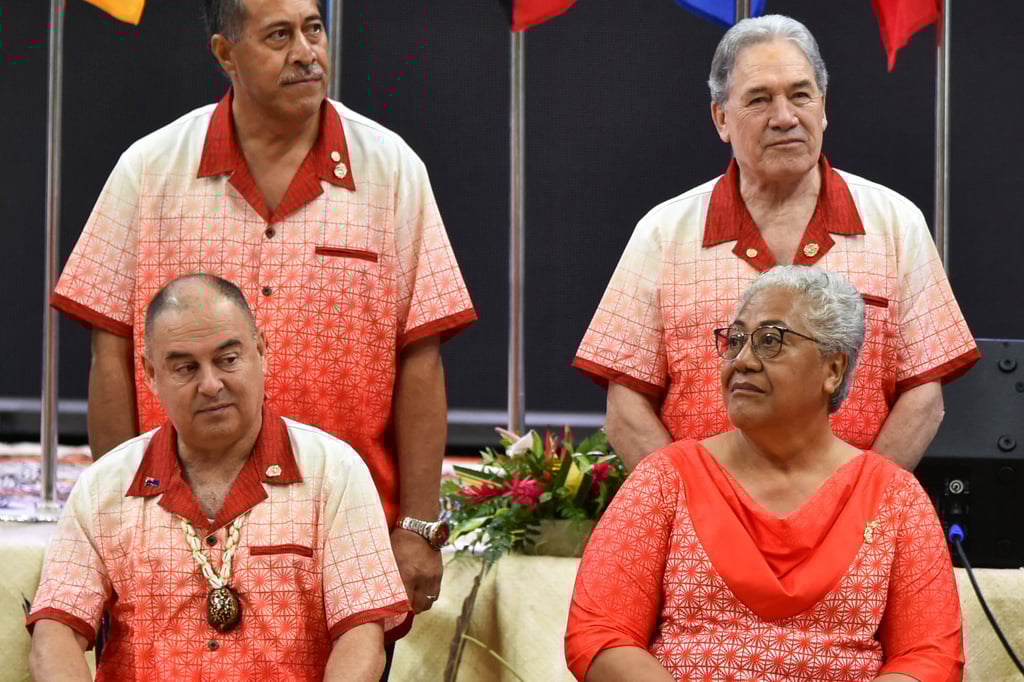 库克群岛总理马克·布朗(左下)与新西兰外交部长温斯顿·彼得斯(右上)出席太平洋岛国论坛会议。摄于去年。照片:法新社