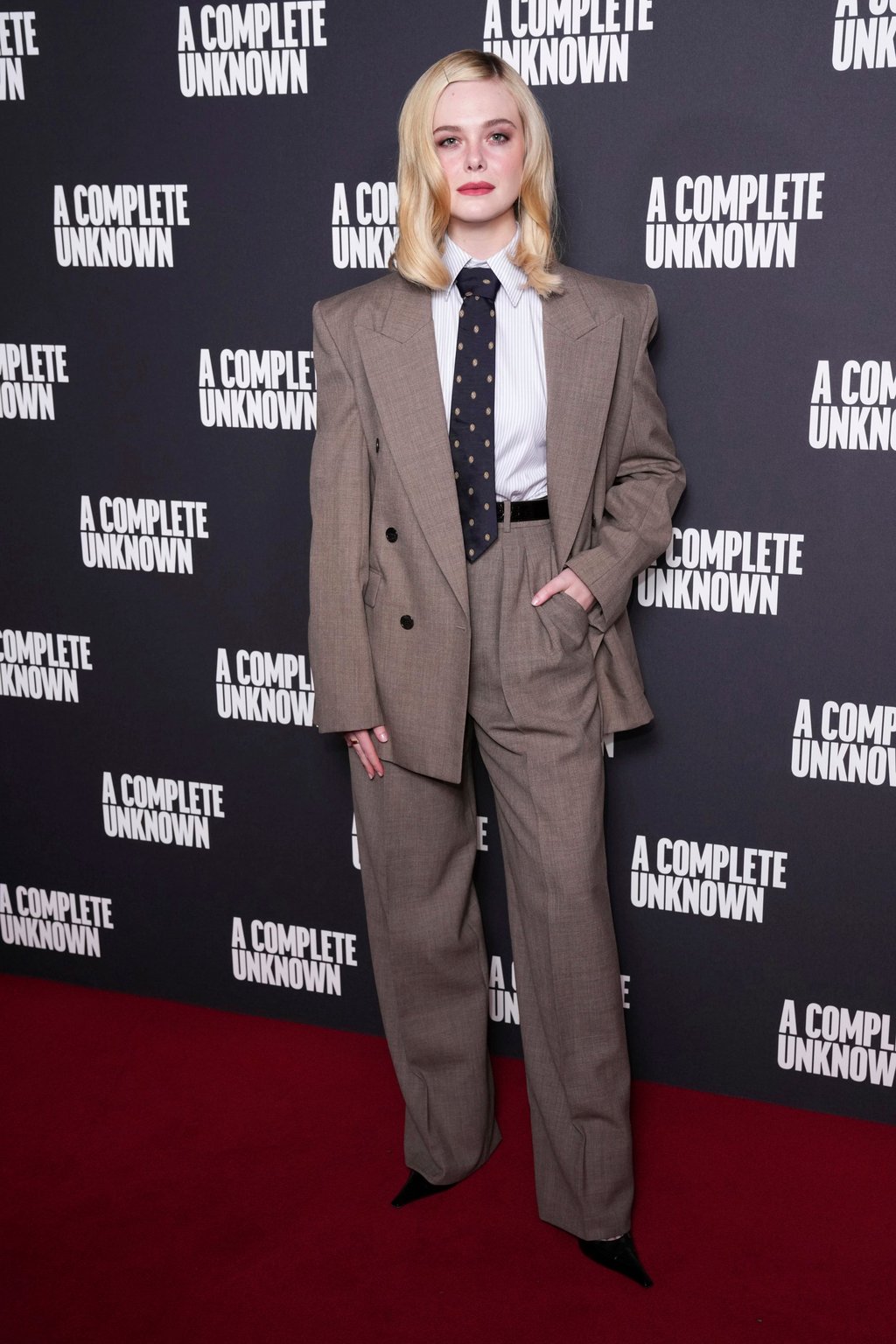 海莉·比伯和艾丽·范宁是最早演绎该法国品牌慵懒西装领带造型的明星。去年十月,比伯在其罗德品牌Barrier Butter发布会上以酒红色领带搭配黑框眼镜,尽显女强人气场。数周后,范宁在其新片《完全未知》伦敦宣传会上穿着近乎相同的棕色套装,以海军蓝领带搭配侧分波浪卷发完成造型。两人均选择条纹衬衫搭配尖头高跟鞋。
