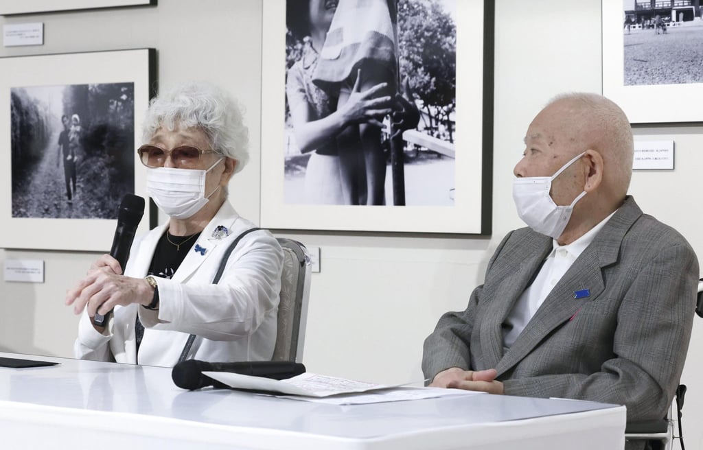 2023年东京某会议上,右为秋弘有本(其女庆子1983年23岁时被带往朝鲜),左为89岁的横田早纪江(其女惠美1977年13岁时遭朝鲜绑架)。共同社图片