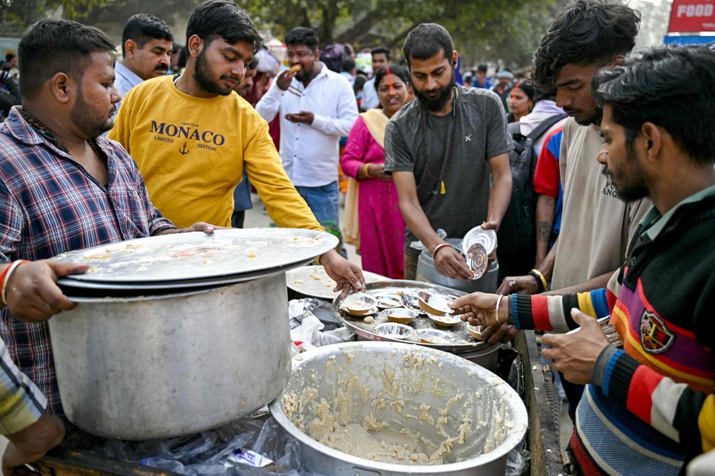 2月1日,志愿者在印度普拉亚格拉吉的玛哈昆布梅拉节期间分发食物。照片:法新社