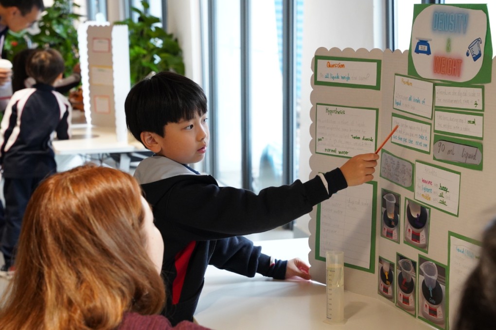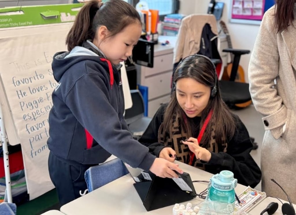 三年级学生使用平板电脑展示作业,这使他们从小就能培养公开演讲能力。这种练习增强了他们的自信心和沟通技巧。