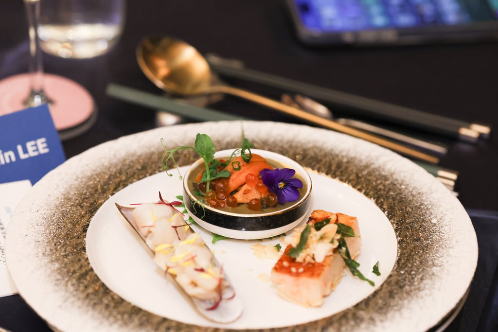 晚宴以三道开胃菜开始——杏仁脆皮鸡皮、腌渍苏格兰蛏子和海胆豆腐配皮蛋酱,搭配2019年费茨威珍藏霞多丽。