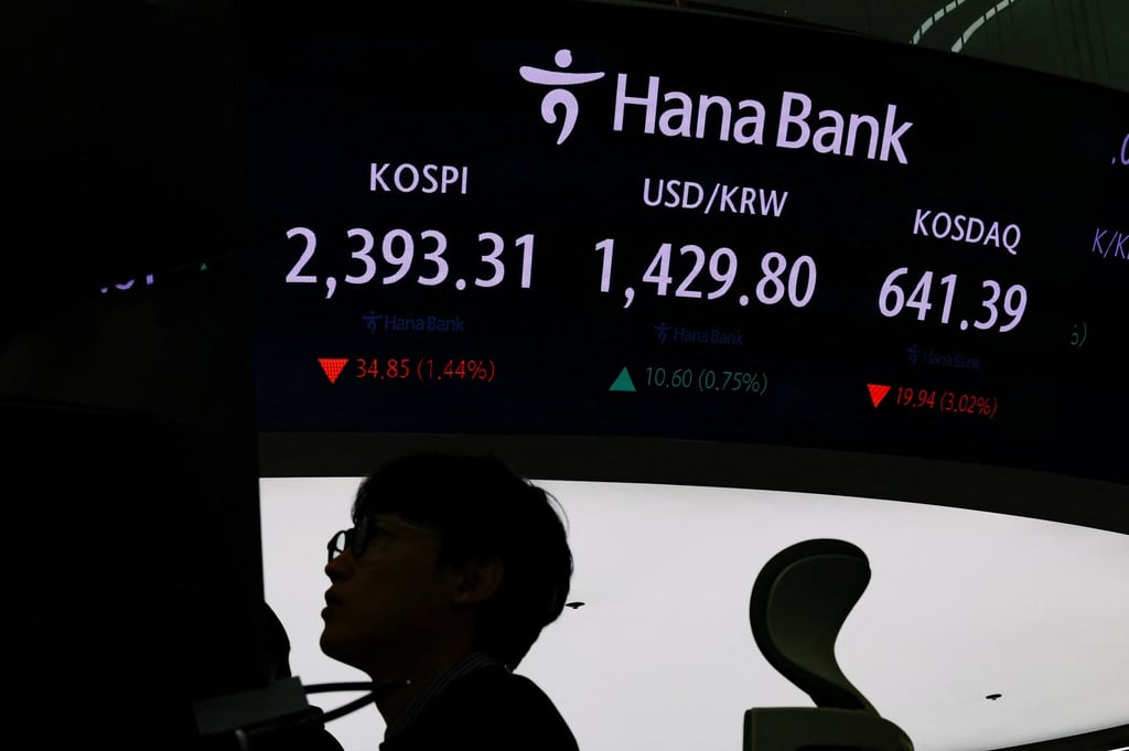 2024年12月9日,首尔一名外汇交易员正在显示韩国综合股价指数及美元对韩元汇率的电子屏幕前工作。照片:路透社