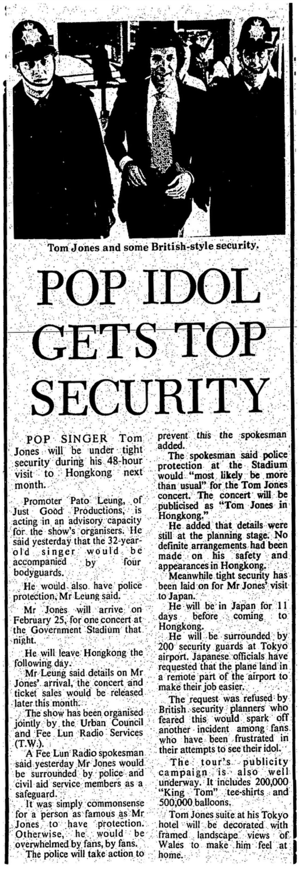 “流行歌手汤姆·琼斯下月访问香港的48小时内将处于严密安保之下,”《南华早报》1973年1月14日报道称。“演出主办方Just Good Productions的策划人梁帕托昨日以顾问身份表示,这位32岁的歌手将有四名保镖随行。梁先生称警方也将提供保护。“费伦电台发言人昨日表示,琼斯先生周围将部署警察和民安队员作为防护措施。像琼斯先生这样的名人接受保护是基本常识,否则他会被歌迷淹没。警方将采取措施防止这种情况发生,发言人补充道。”