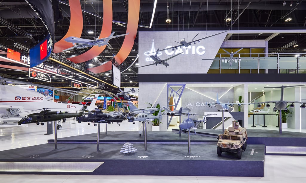 阿布扎比2025国际防务展上展出的战斗机、无人机及运输机等航空产品。图片来源:中国航空工业集团