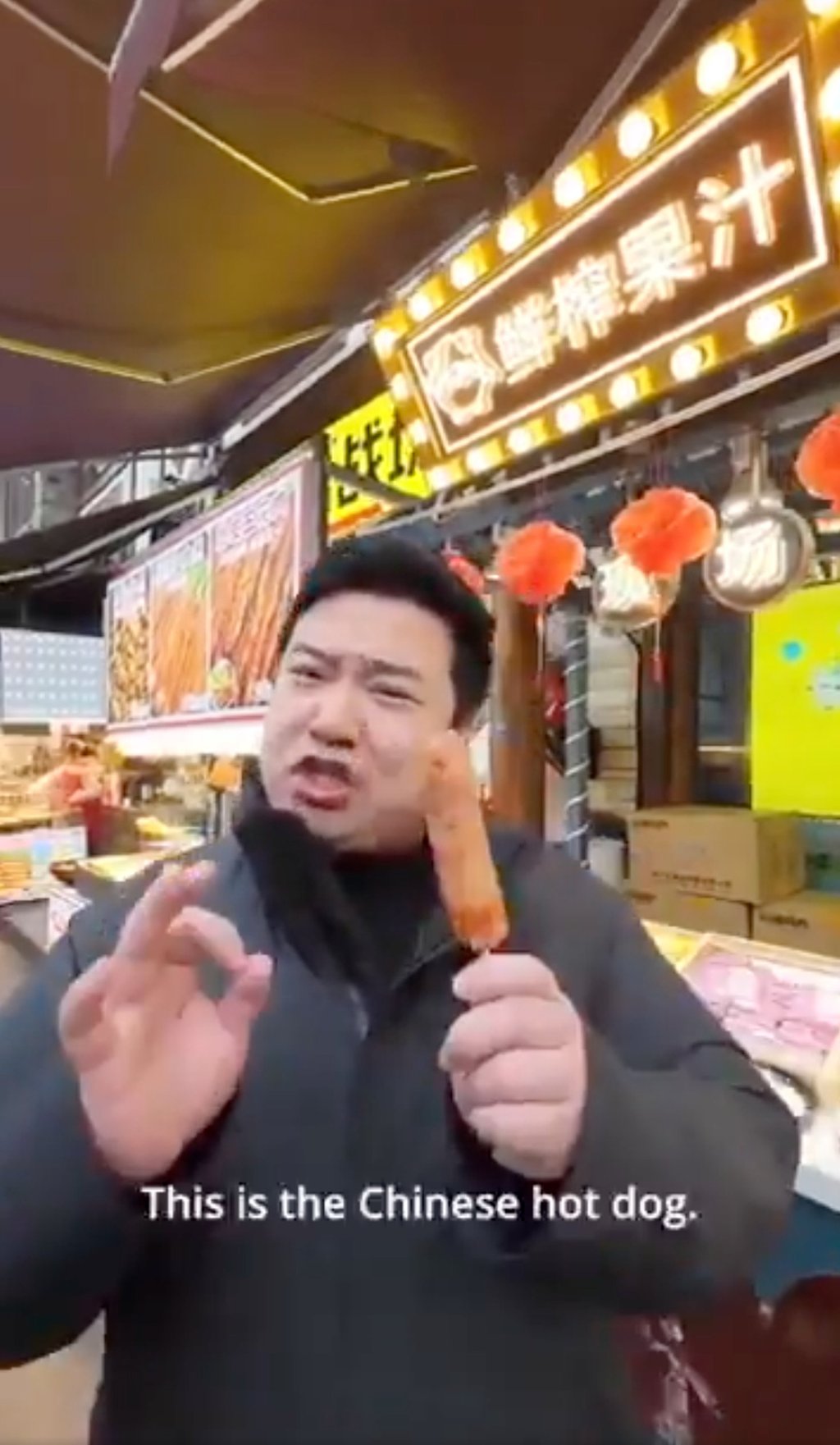 在网络流传的短视频中,这位中年男子似乎用外套填充物让自己显得更壮实,他操着流利英语并模仿特朗普的口音,在中国西南部重庆的街头推销一种香肠。