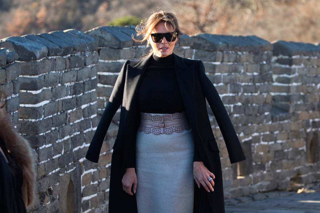 2017年梅拉尼娅游览长城某段。中国网友用"英姿飒爽"“气场强大"“雍容威严"等词汇形容这位美国第一夫人。图片来源:美联社