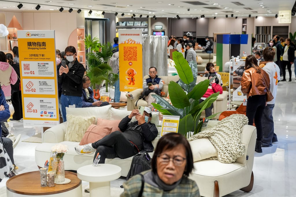 上周六,约100名顾客在尖沙咀中港城的"趴趴家"门店外排队等候开业。这家2322平方米的店铺展示了来自100家淘宝商家的超万件家具产品。