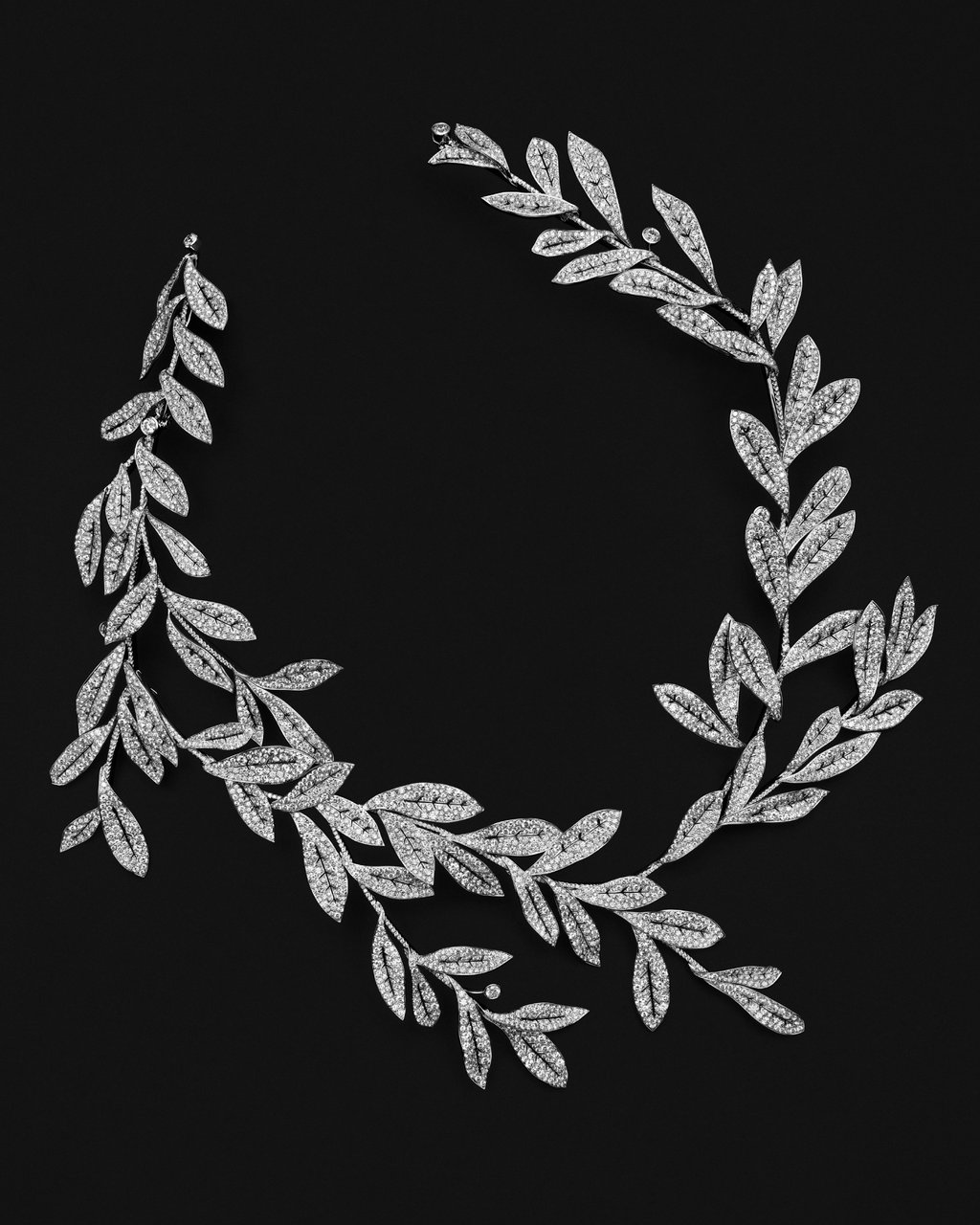 系列中的惊艳之作当属越橘项链,这件可转换式设计杰作灵感源自极地耐寒灌木。灵活结构中铺镶钻石的叶片随身体曲线流动,部分组件可拆卸为瀑布式胸针,尽显宝诗龙对动态平衡的绝妙掌控。