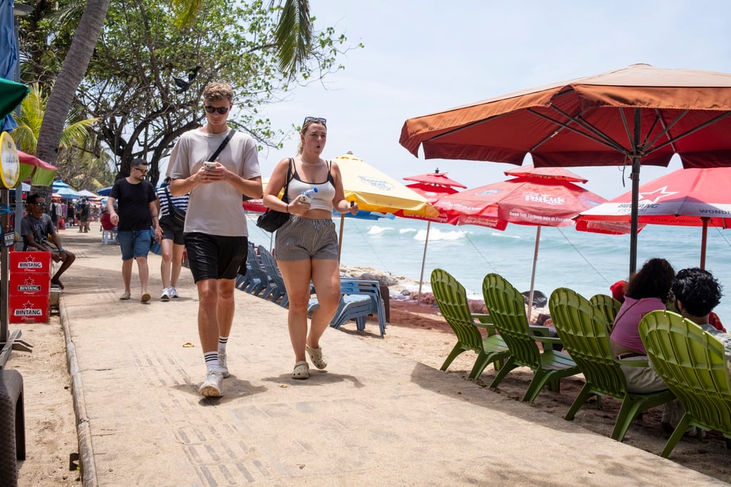 2月3日,游客漫步于印尼巴厘岛库塔海滩。去年巴厘岛共接待630万外国游客。图:EPA-EFE
