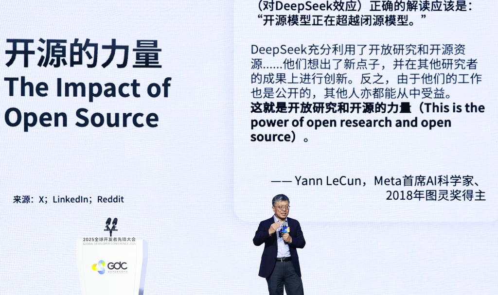微软资深研究员沈向洋(Harry Shum Heung-yeung)在全球开发者大会开幕式上发表关于开源AI重要性的演讲。图片来源:主办方提供