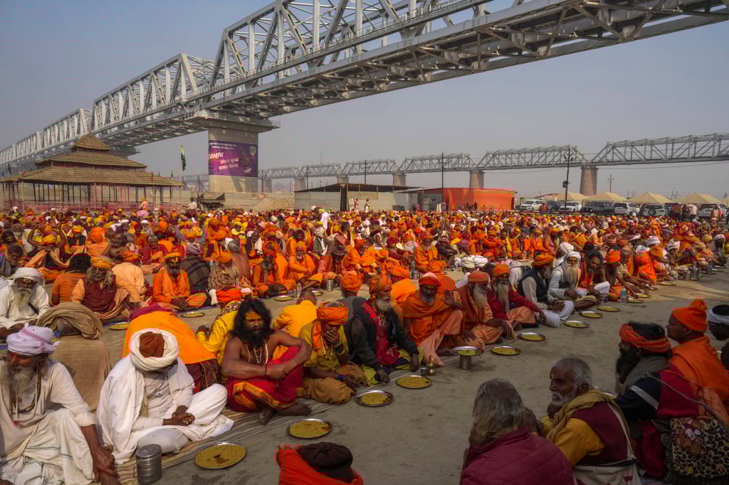 印度普拉亚格拉杰,印度教苦行僧们在节日期间参加集体盛宴。美联社照片