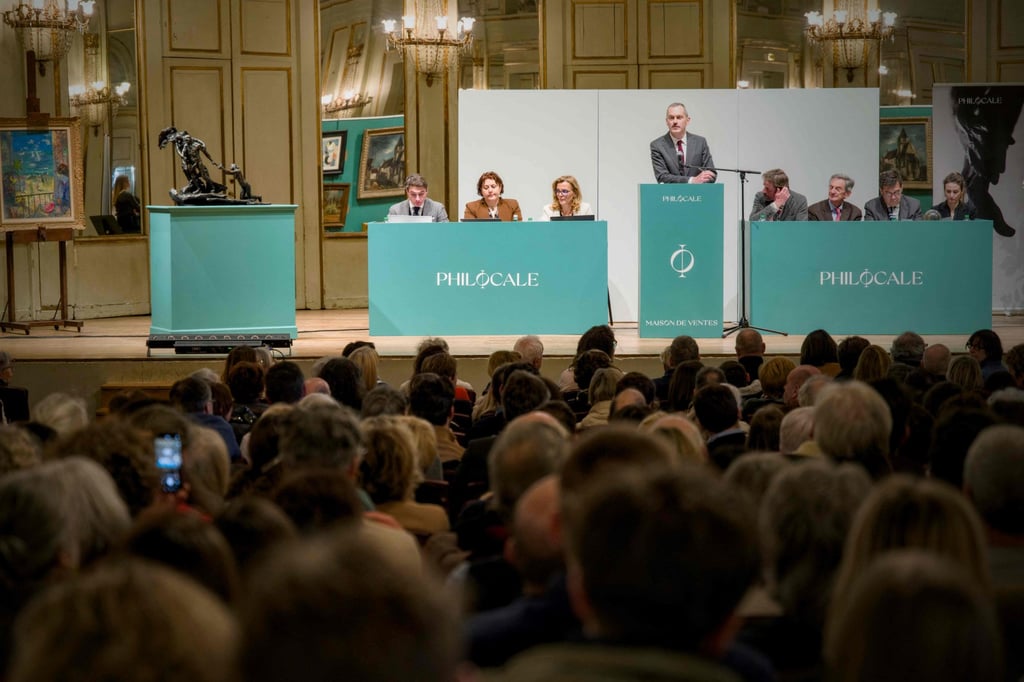 2月16日,拍卖师马蒂厄·塞蒙在奥尔良主持法国雕塑家卡米耶·克洛岱尔青铜作品《成熟年代》的拍卖会。法新社摄