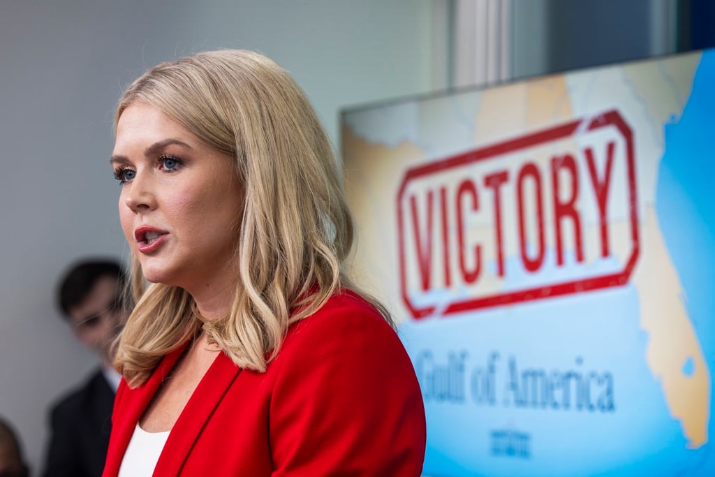 周二,白宫新闻秘书卡罗琳·莱维特在新闻发布室向记者讲话时,身后出现"美国海湾"标志。图片来源:EPA-EFE