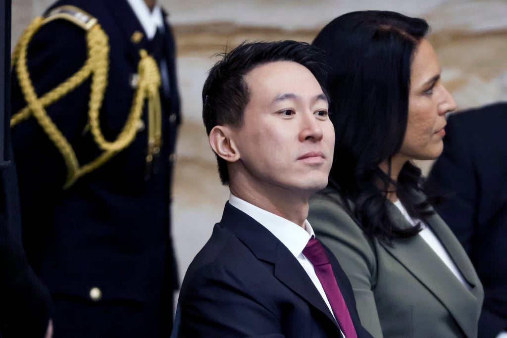 TikTok首席执行官周受资(中)于2025年1月20日在华盛顿特区美国国会大厦圆形大厅参加美国总统唐纳德·特朗普的就职典礼。照片:TNS