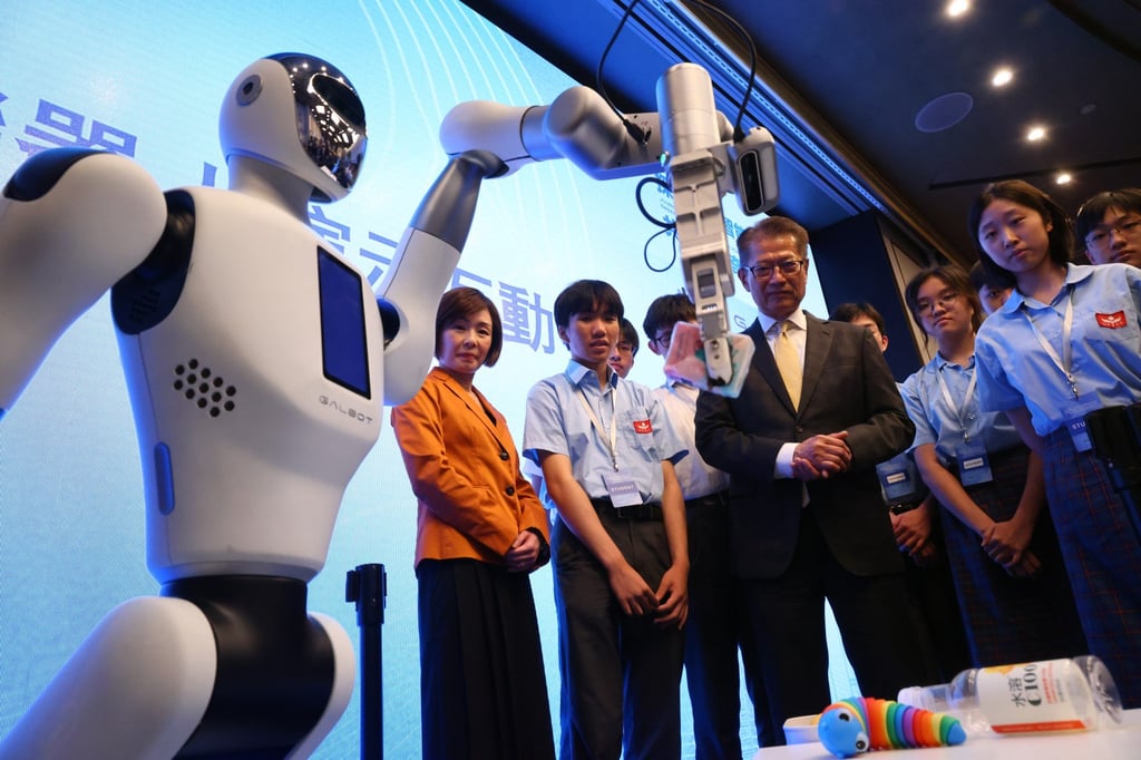 财政司司长陈茂波在港岛香格里拉酒店出席香港投资管理有限公司与Galbot联合推动AI的启动仪式,观看机器人演示。摄影:Dickson Lee
