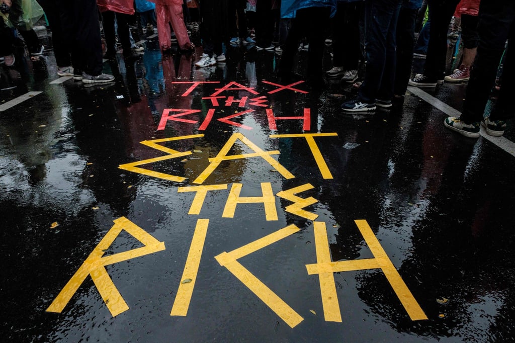 上月雅加达抗议活动中,学生和活动人士制作了写着"向富人征税,吞噬富人"的标语,反对总统普拉博沃·苏比安托的预算削减政策。照片:法新社