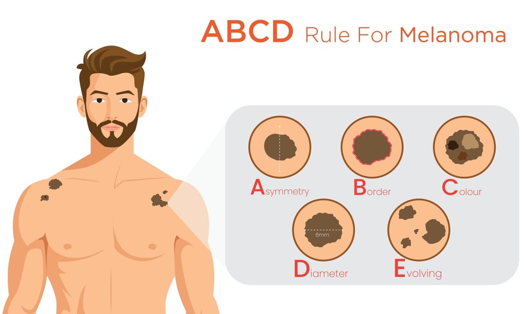 若突然出现新痣或原有痣发生明显变化,这可能是皮肤癌的信号。请遵循ABCDE原则——不对称性;边缘不规则;颜色不均,如深浅不一的棕黑色中夹杂红、蓝或灰色;直径通常大于铅笔橡皮头;以及观察是否持续演变,包括大小、形状、颜色或隆起程度的变化。