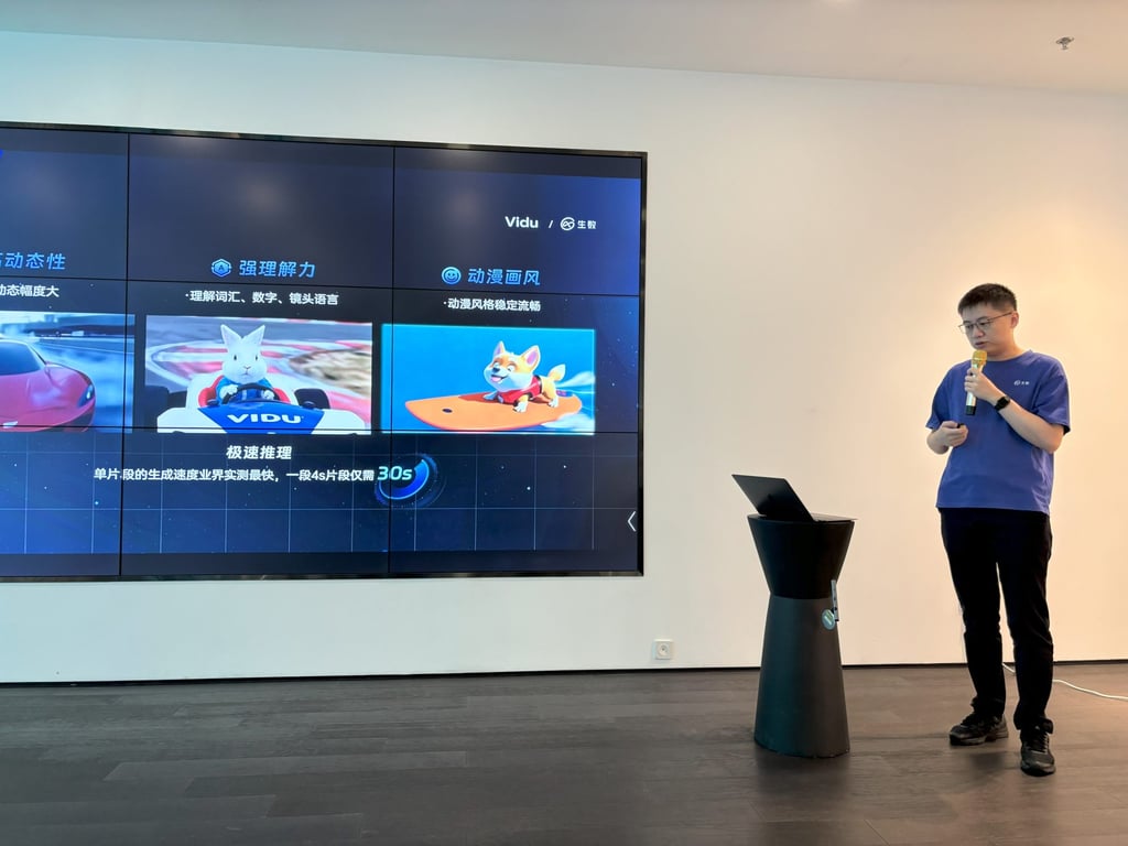 生数科技联合创始人兼总裁唐家渝介绍公司新款视频工具。照片:Ben Jiang