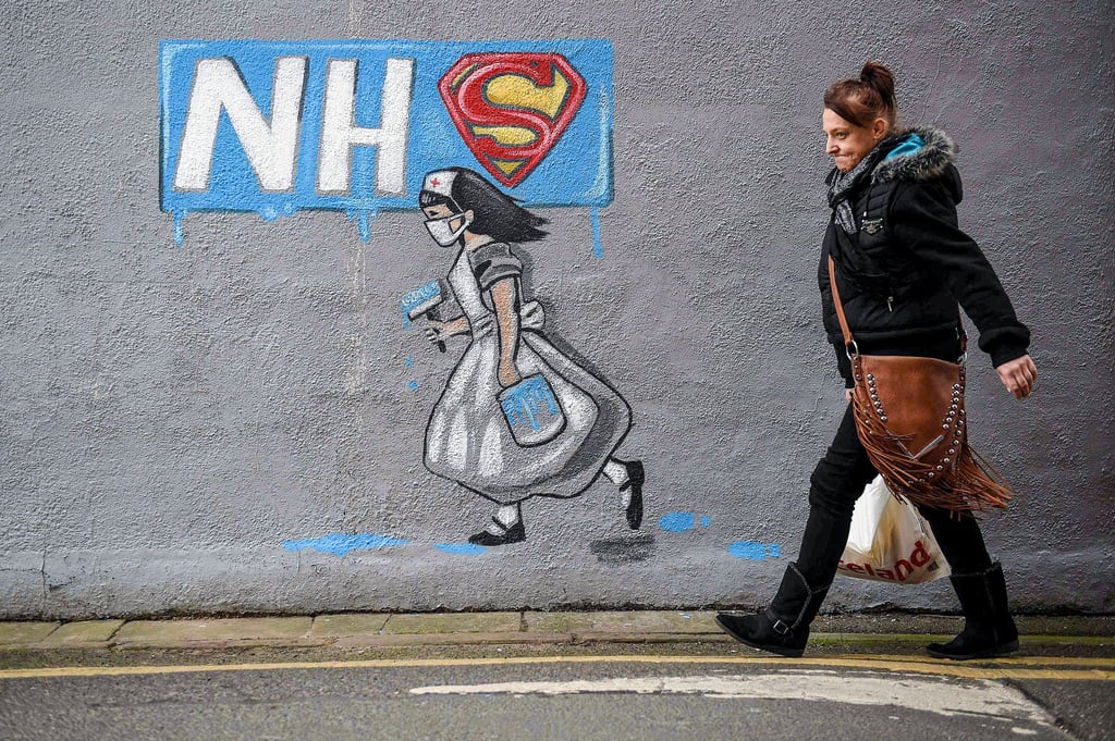 2020年英格兰北部,行人走过绘有英国国民医疗服务体系标志的涂鸦墙。照片:法新社