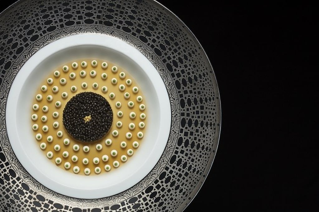 精准与奢华的杰作。天巢法国餐厅的鱼子酱配帝王蟹佐甲壳类冻,展现了高级料理的精髓。