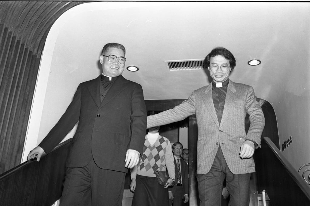 主教胡振中(左)于启德机场,身旁是天主教社会传播处主任杨鸣章神父。照片:P.Y. Tang