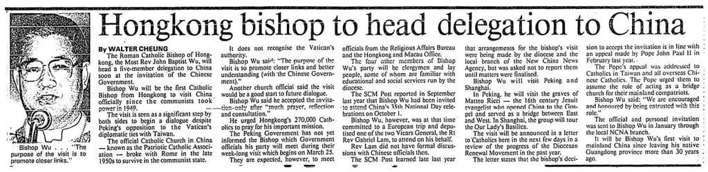 “香港罗马天主教主教胡振中将应中国政府邀请,率五人代表团近期访华,”《南华早报》1985年3月14日报道。“胡主教将是自1949年共产党执政以来首位正式访问中国的香港天主教主教。尽管北京反对梵蒂冈与台湾的外交关系,此次访问被视为双方开启对话的重要一步。