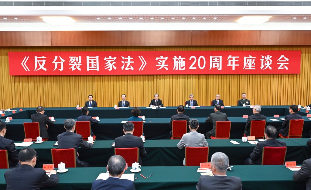 中国大陆第三号官员在周五北京举行的《反分裂国家法》实施20周年座谈会上呼吁"进一步完善"反"台独"法律体系。《反分裂国家法》。全国人大常委会委员长赵乐际表示,北京应"坚决打击’台独’分裂行径和外部势力干涉"。