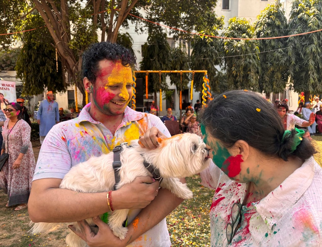 尽管彩色粉末通常被认为对宠物的皮肤、毛发和健康有害,但在胡里节期间,主人们仍会为爱宠额头点上彩粉,以此表达亲昵之情。