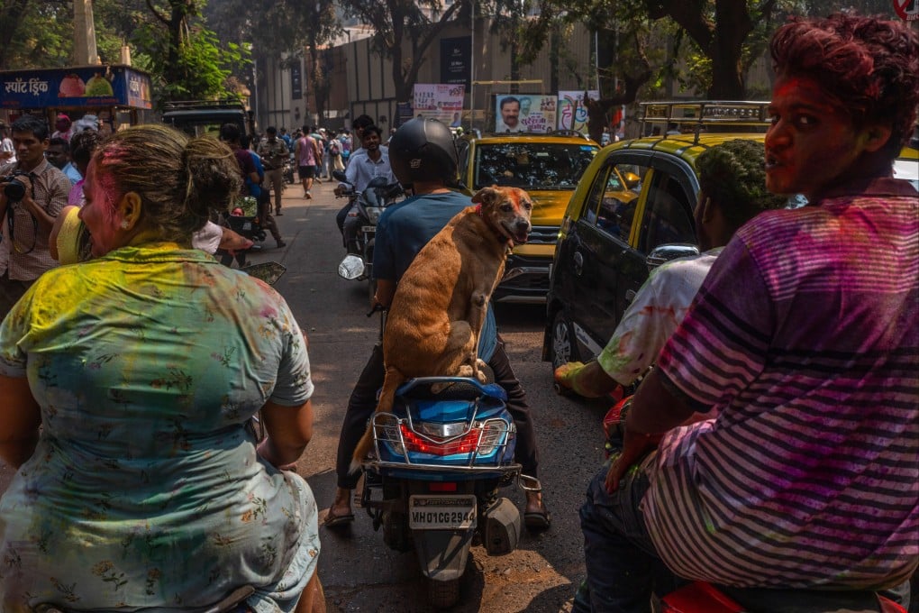这只额头点着朱红粉末、栖息在车座上的狗,象征着许多家庭将宠物视为家人并让它们参与节庆活动的习俗。上周五正值印度教色彩节胡里节,全城欢庆。
