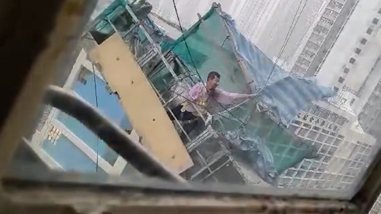 香港建筑工人命悬一线 强风中吊篮惊魂