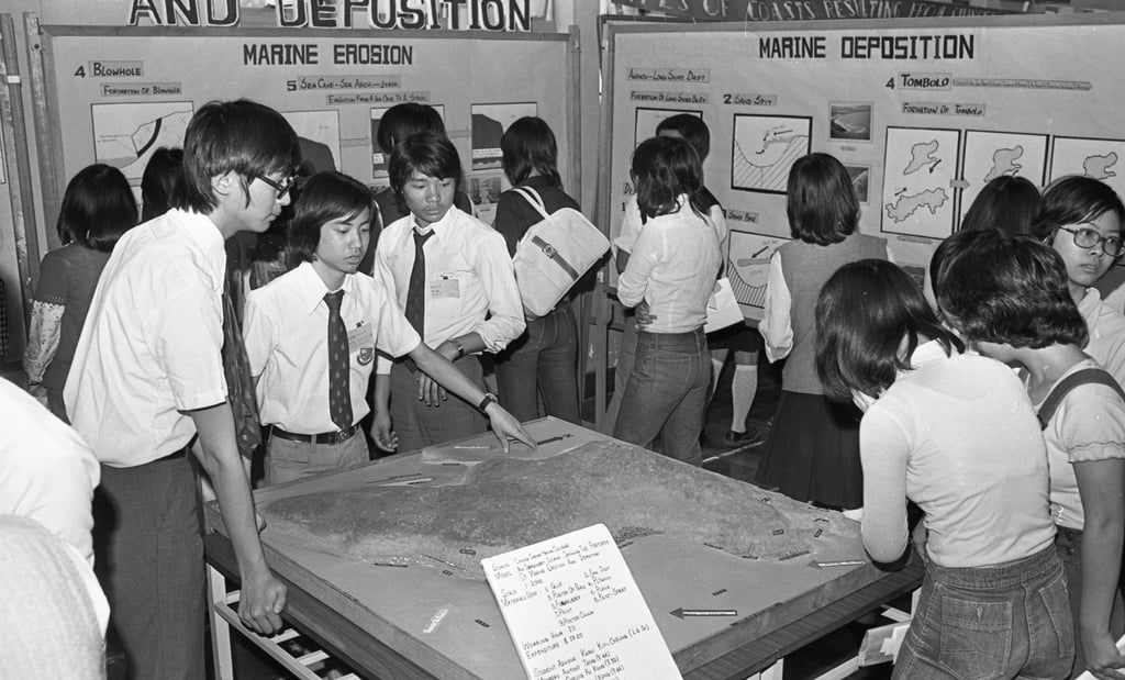 1977年圣若瑟书院地理展览会上,参观者正在欣赏展品。摄影:Sunny Lee