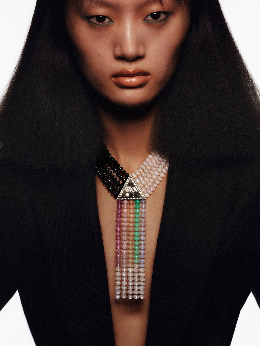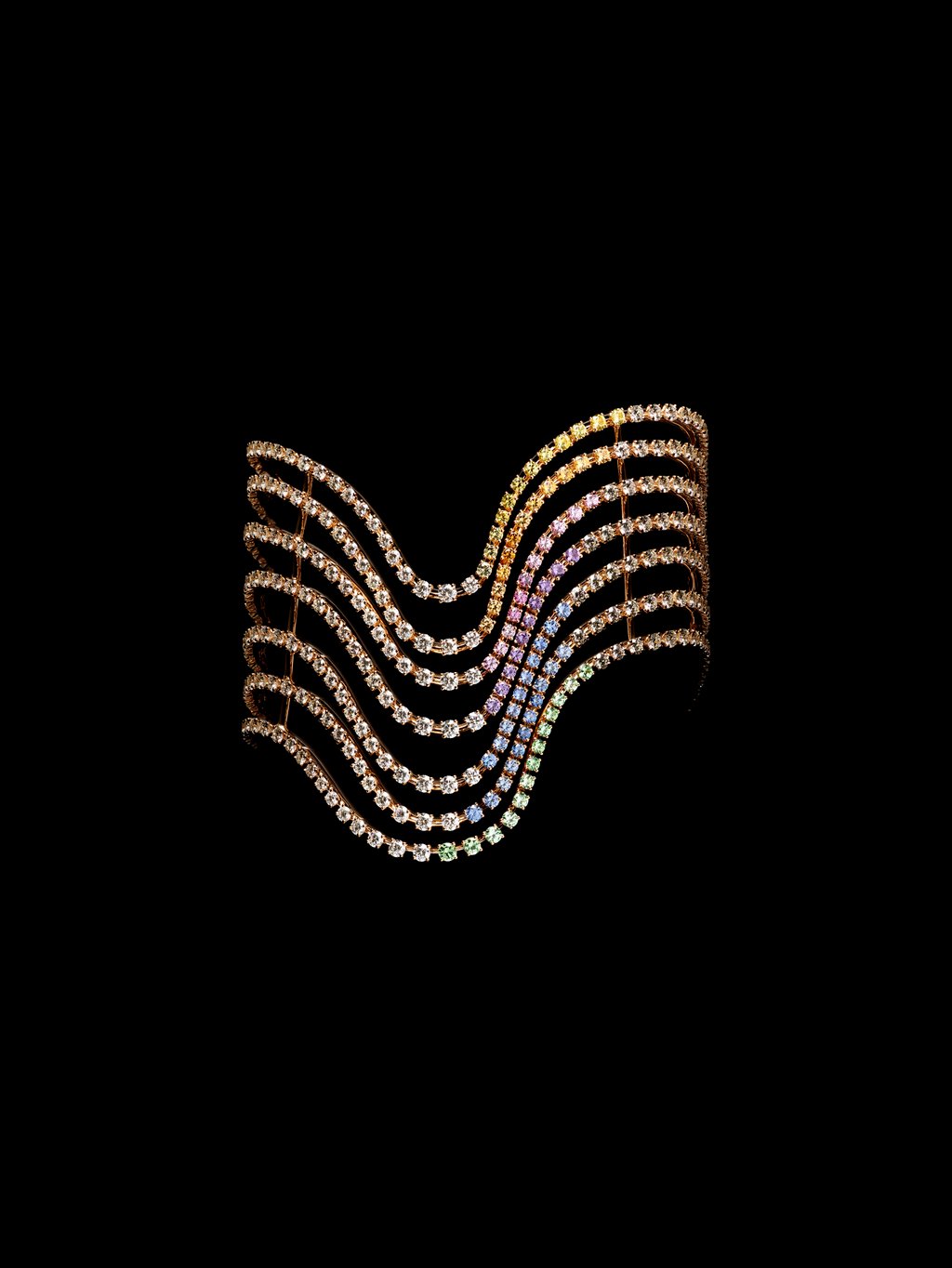 除了结构,该系列还巧妙运用了纹理与动态感。Fresh Paint系列作品以珍贵及半宝石在帆布上勾勒出流畅的笔触效果,营造出层次丰富的绘画质感。Arc en Couleurs系列中,铰接式手镯与项链通过精妙的色彩渐变闪烁微光——其中一条项链精选近1400颗宝石,才实现其无缝衔接的色谱效果。这些作品专为贴合人体曲线设计,既像珠宝又似可穿戴艺术品。“我想探索整个色谱,“哈迪解释道,“与其抑制多样性,我更想颂扬它。”