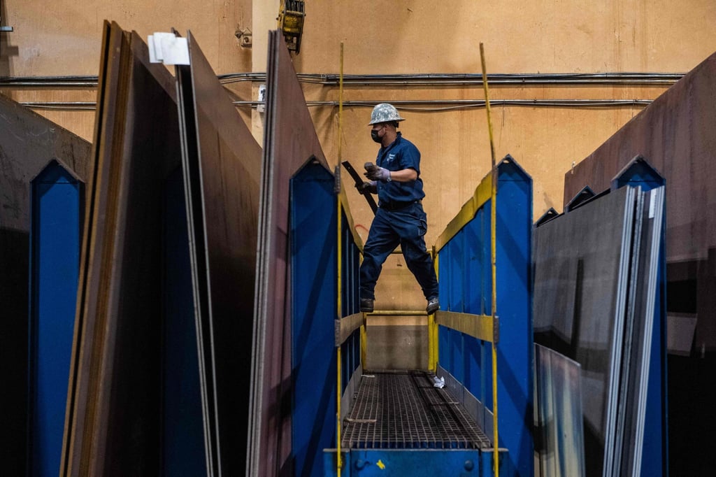 3月13日,马萨诸塞州马尔堡中央钢铁供应公司,工人正在操作钢板。特朗普曾威胁将对加拿大进口钢铝关税从25%提升至50%,但次日便撤回加征关税决定。图片来源:法新社