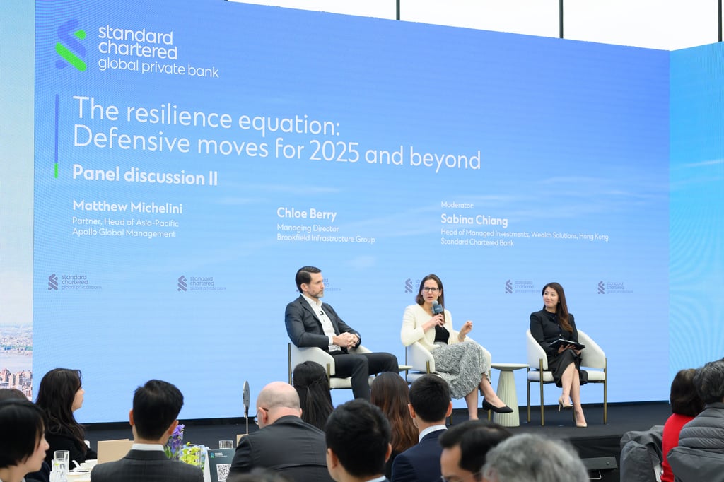 阿波罗全球管理公司的马修·米凯利尼(左)与布鲁克菲尔德基础设施集团的克洛伊·贝里(中)正在探讨2025年及以后的防御性投资策略。