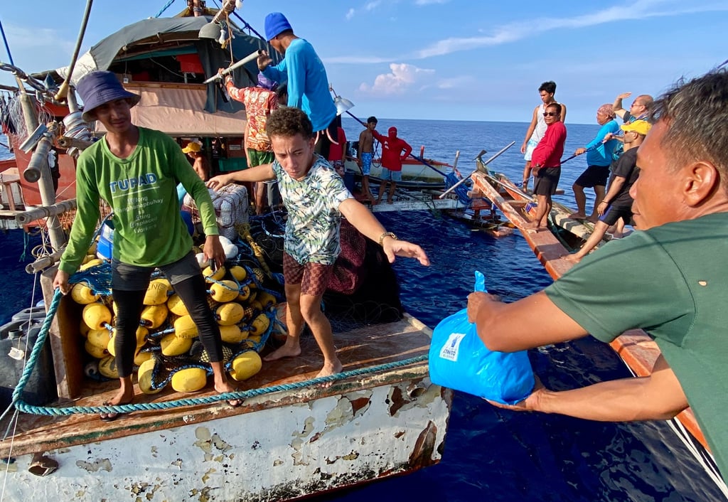 2024年5月16日,由民间主导的“Atin Ito!”联盟救援任务的菲律宾志愿者在有争议的南海水域向一艘机动木船上的渔民分发救援物资。照片:EPA-EFE
