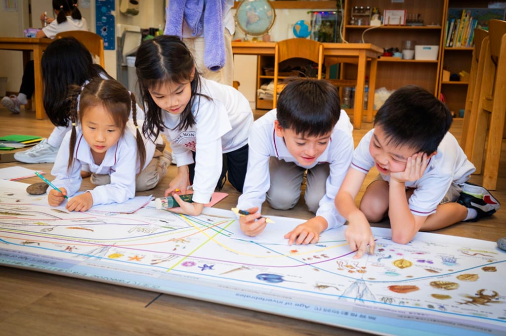 每学年伊始,课程围绕五大主题展开:宇宙的形成、生命的诞生、人类的历史、符号的交流以及数字的故事。这一综合课程通过叙事激发好奇心,让学生追随兴趣深入特定学习领域,启发超越课堂边界的探索。在每班两位教师中,一位可能以英语讲述故事或演示开场,阐述关键事实和观点。另一位教师则交替使用普通话对特定要点进行拓展,可能还会发起讨论或指出需深入研究的重点领域。这种方式能激发各类疑问,促使学生争相查阅教室或学校图书馆的有用书籍资料,并以更有机自然的方式培养真正的双语流利度。