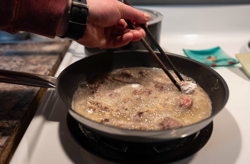 马修·博森斯将云杉松鸡放入煎锅,准备制作本地版糖醋猪肉料理。摄影:克里斯特尔·希克