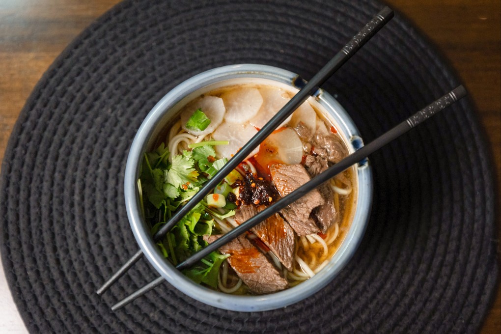 汤底熬好后浇在奇奇手工拉制的面条上,每碗加入文火慢炖的软嫩驼鹿腿肉和切得极薄的白萝卜片。最后撒上葱花香菜,淋少许黑醋和辣椒油收尾。