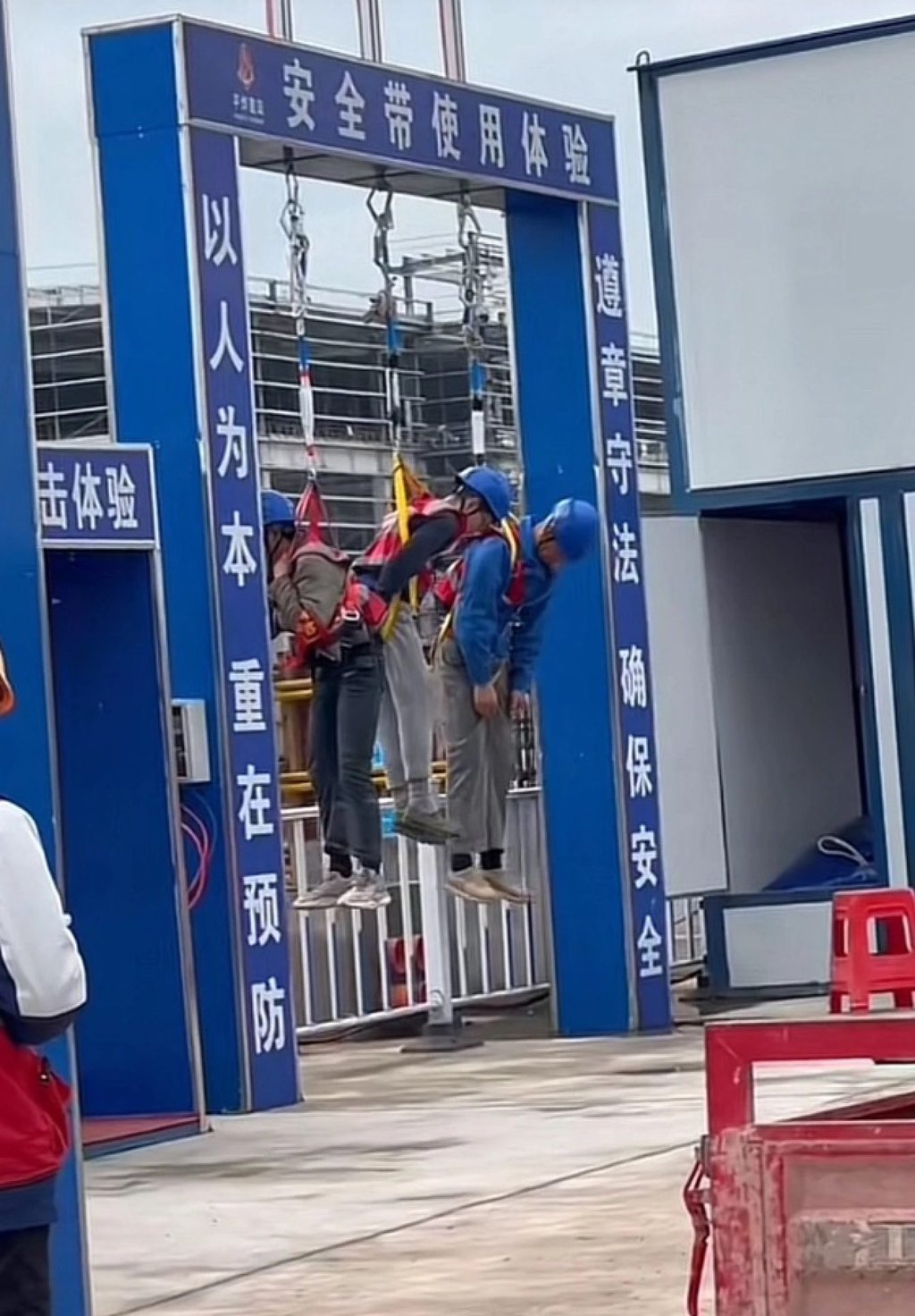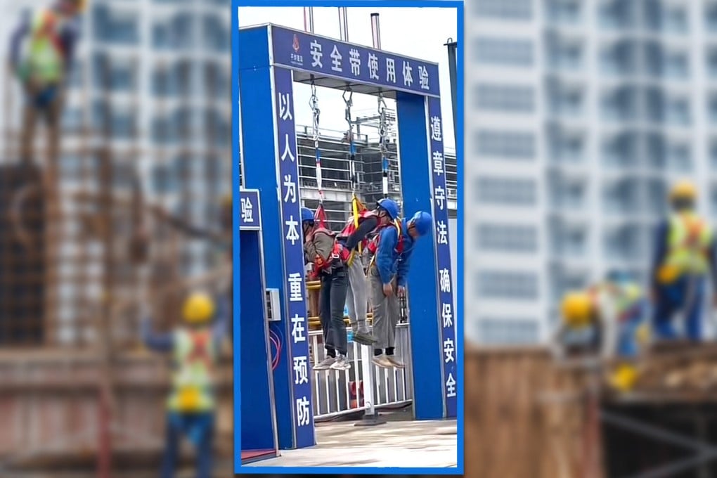 一群中国建筑工人因未佩戴安全装备作业,被用安全吊带悬挂在工地大门上进行"体验式安全教育"。