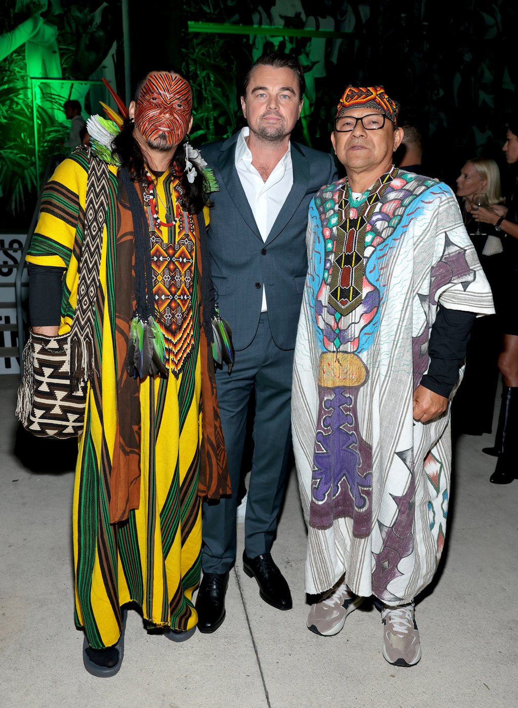莱昂纳多·迪卡普里奥是另一位狂热的艺术收藏家。图中他正与亚马逊艺术家Nixiwaka Yawanawá和Isku Kua Yawanawá在2023年迈阿密Re:wild举办的"自然艺术巴塞尔"活动上合影。图片来源:Getty Images