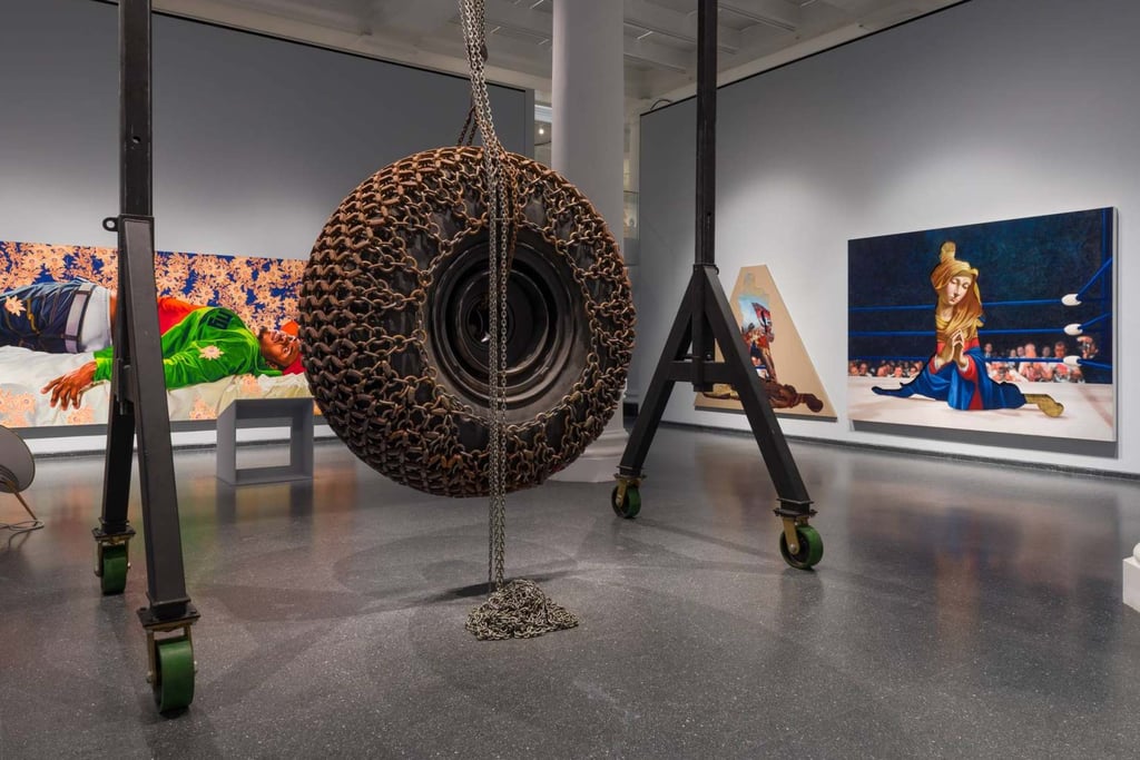 “巨人"展品包括亚瑟·贾法用巨型卡车轮胎包裹铁链创作的雕塑,令人联想到一面巨锣。图片来源:Handout