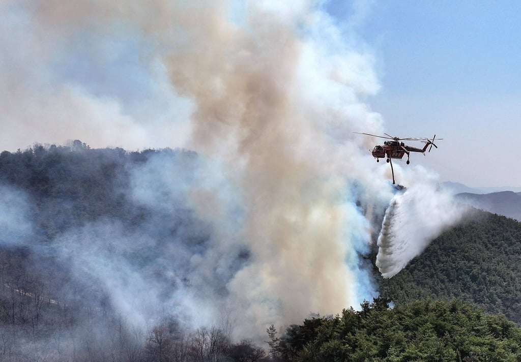 周日,韩国山林厅直升机在庆尚北道义城郡扑救森林火灾。图片来源:韩联社/法新社