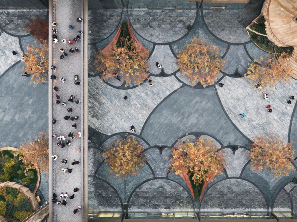 设计团队从西安著名的兵马俑中汲取灵感,将中国陶瓷砖作为项目主要建筑的外立面材料。赫斯维克补充道,这些纹理独特、图案精美的瓷砖近距离观赏时,其特殊釉面呈现出"手工精修的魅力”。他提到,虽然铺装"通常呈现严格的网格状",但在西安CCBD项目中,团队从银杏叶的有机形态获得启发,打造出"如迎宾扇般铺展在入口通道"的铺地石材,同时"形成了更宏大且柔和的纹理图案"。