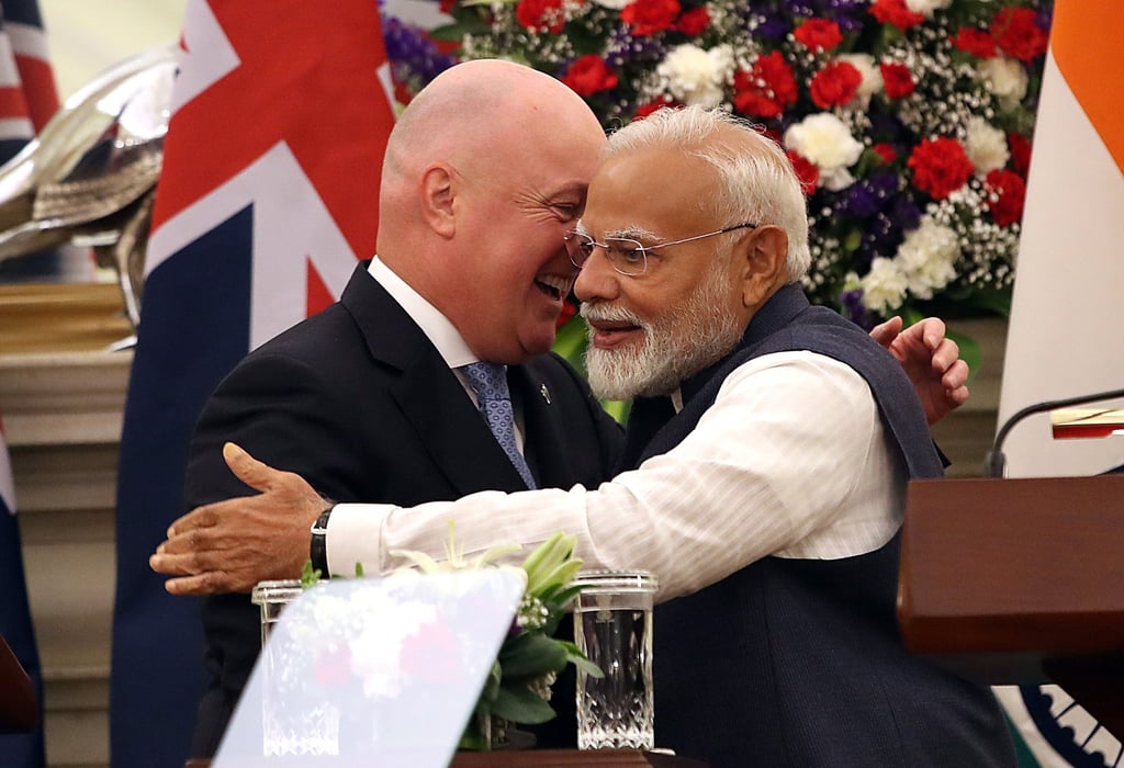 3月17日,印度总理纳伦德拉·莫迪(右)在新德里海得拉巴大厦会议后发表声明时拥抱新西兰总理克里斯托弗·拉克森。照片:EPA-EFE