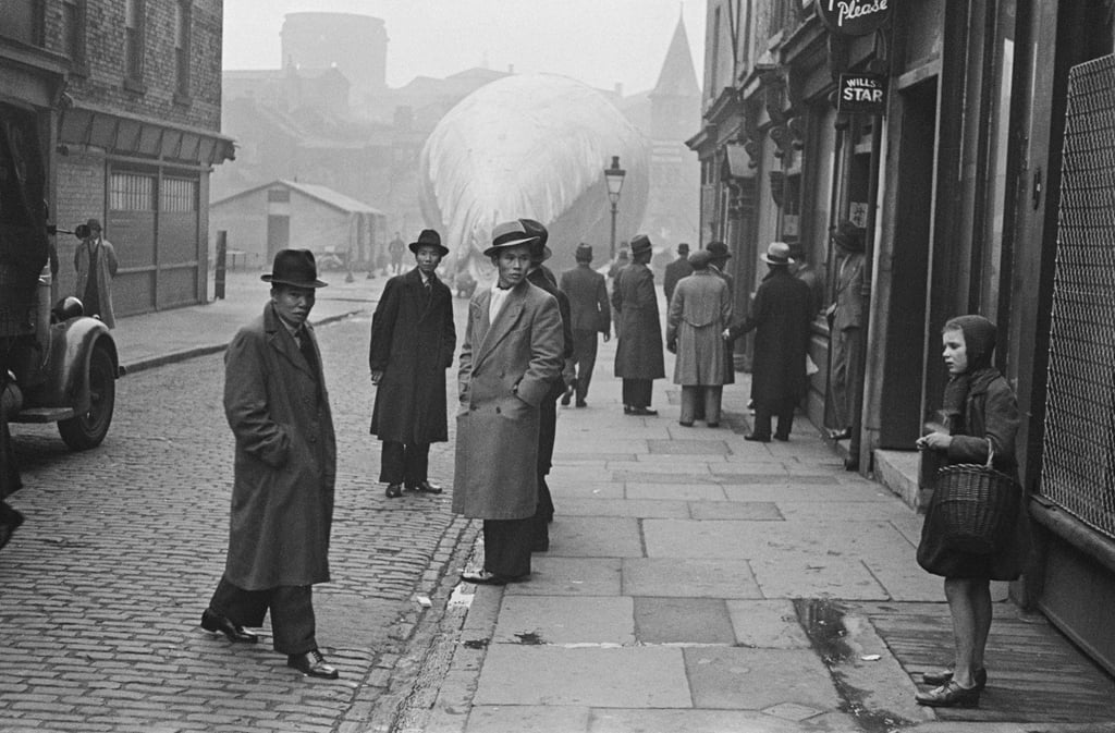 1940年利物浦街头行走的华人,背景可见部分充气的防空气球。图片来源:盖蒂图片社
