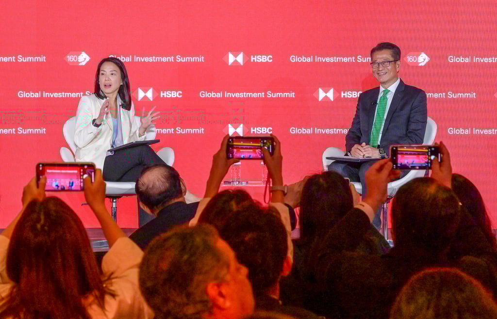 财政司司长陈茂波(右)在周二的汇丰全球投资峰会上。照片:ISD