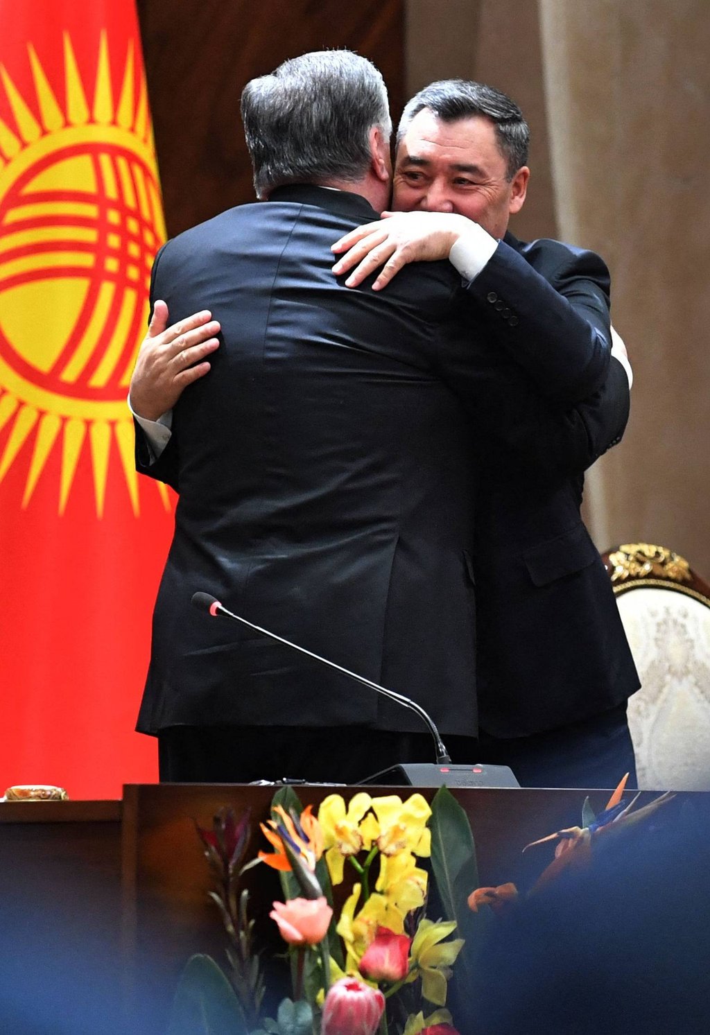 3月13日,吉尔吉斯斯坦总统萨德尔·扎帕罗夫(面向镜头者)与塔吉克斯坦总统埃莫马利·拉赫蒙在比什凯克会谈后联合记者会上拥抱。法新社