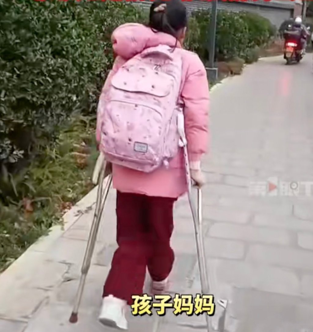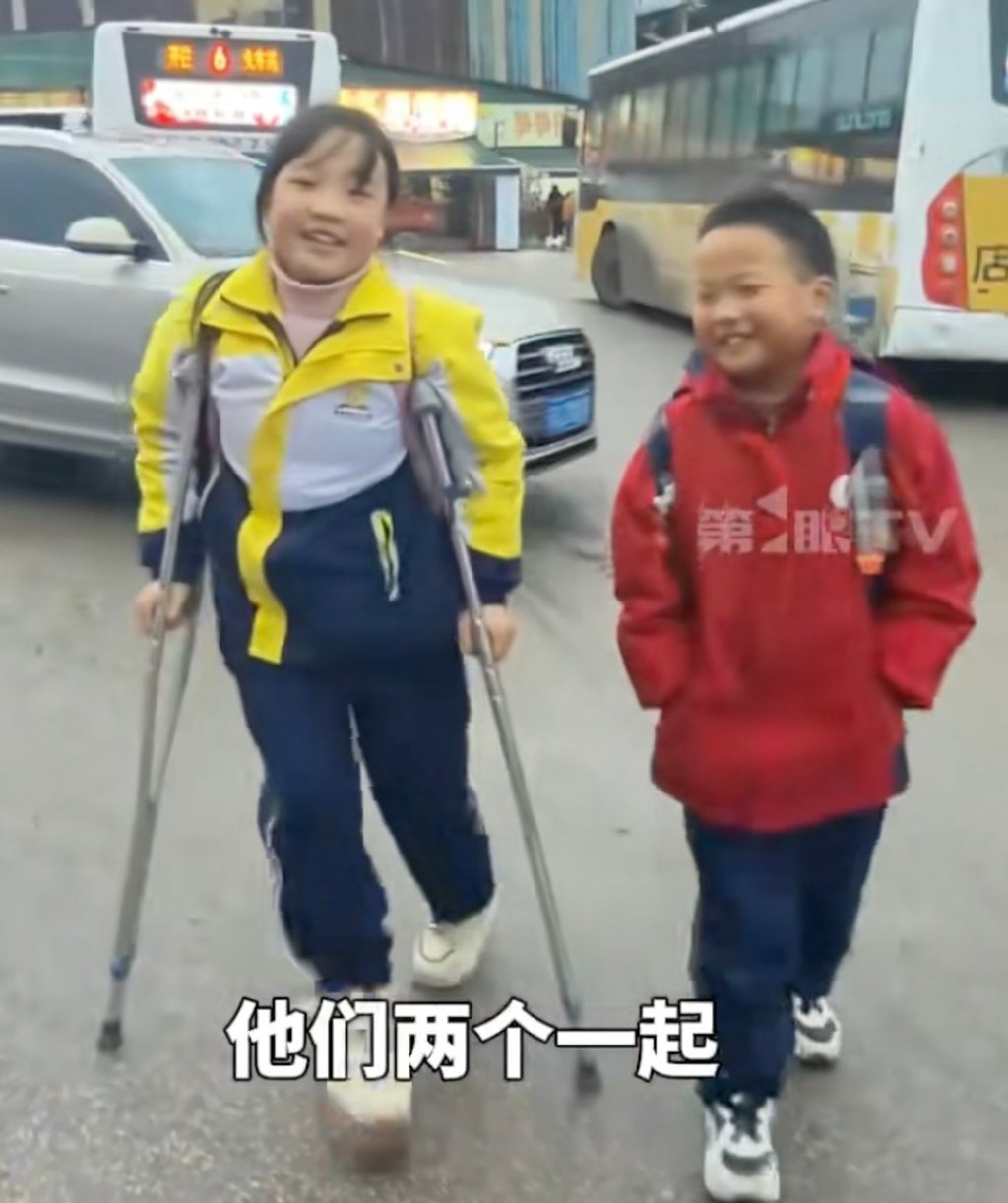 姐弟俩随后会步行一小段路换乘回家的公交。母亲拍摄的走红视频显示,男孩总是一边帮姐姐拿拐杖,一边开心地聊天。