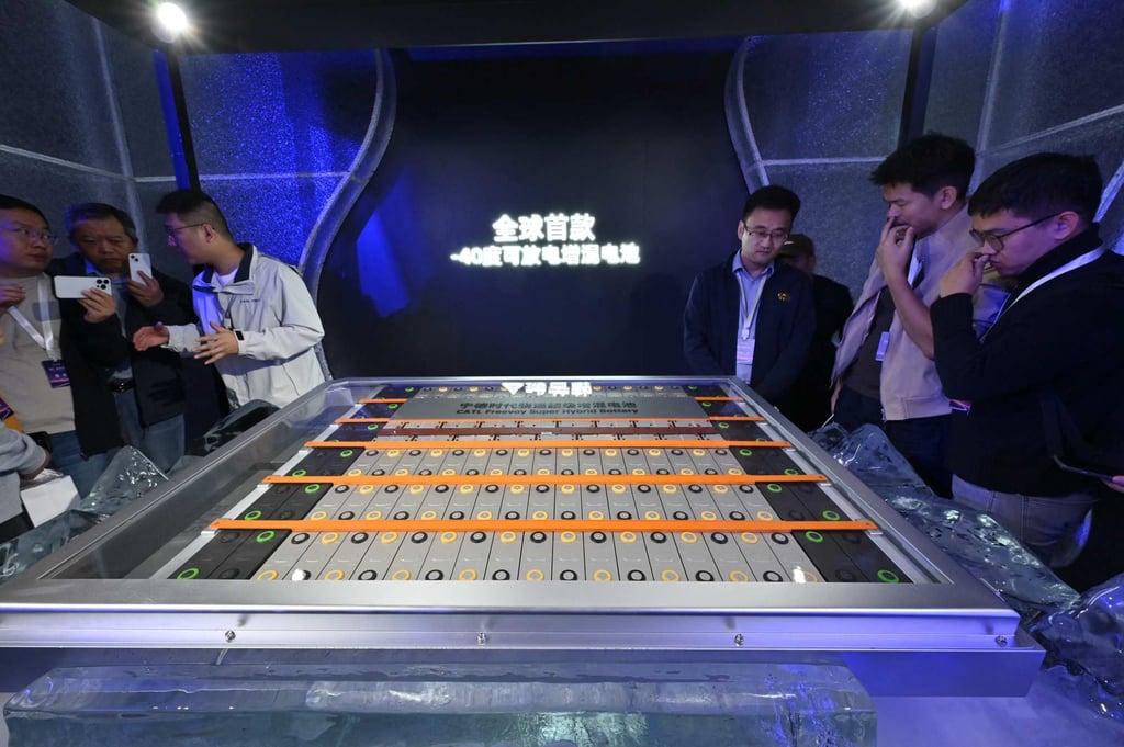 2024年10月24日,北京展示的宁德时代生产的Freevoy超级混合动力电池模型。照片:法新社